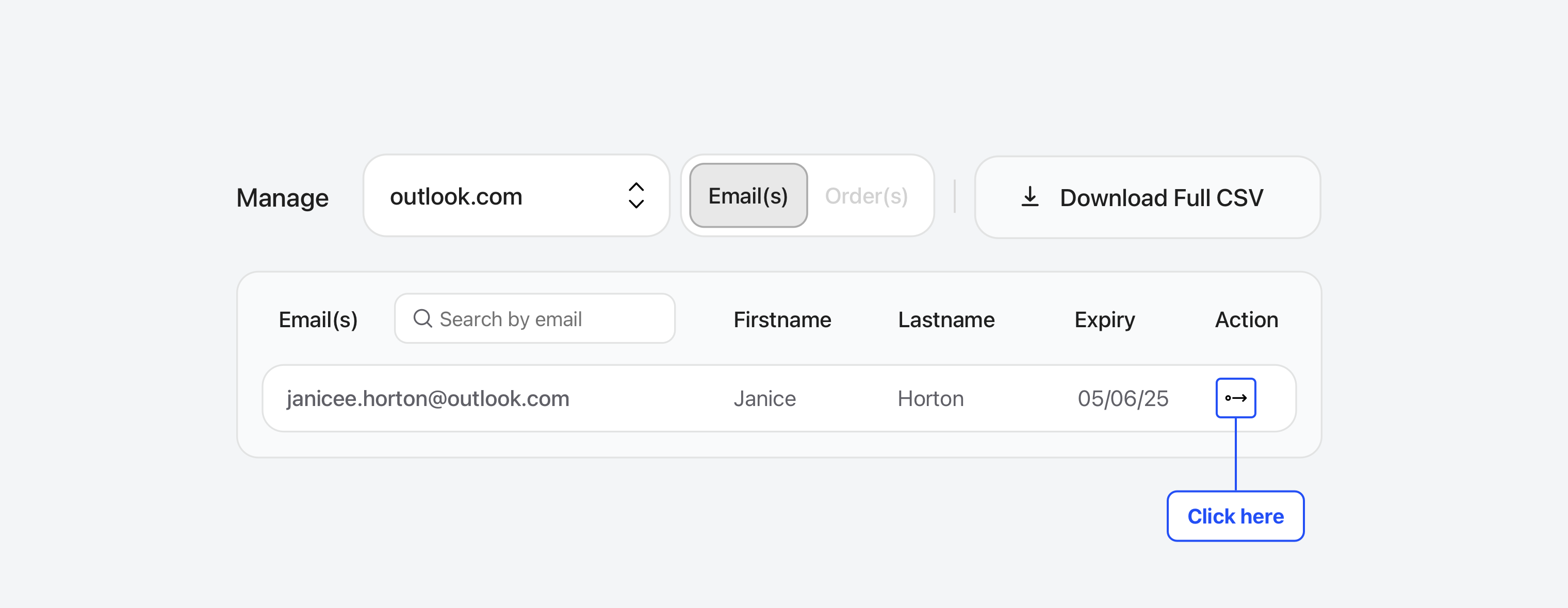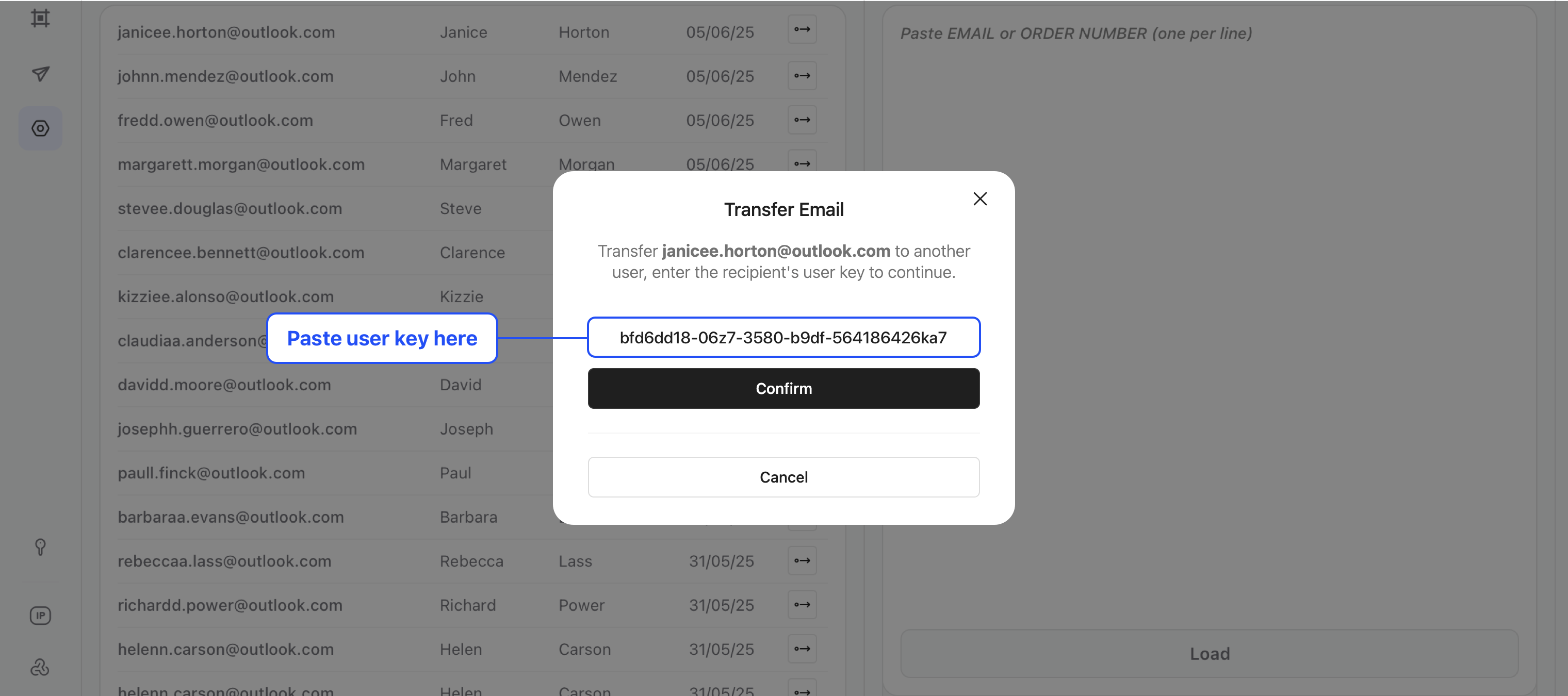 Get the recipient’s **transfer key**. Go to the **Manage** tab, find the email address, click the **transfer icon**, and enter the key. Et Voilà ! The transfer happens instantly.